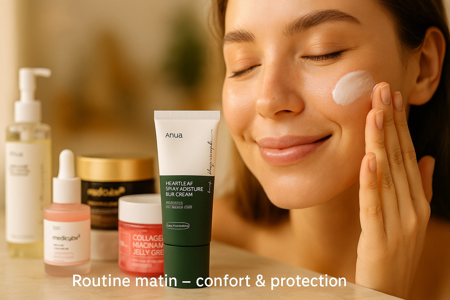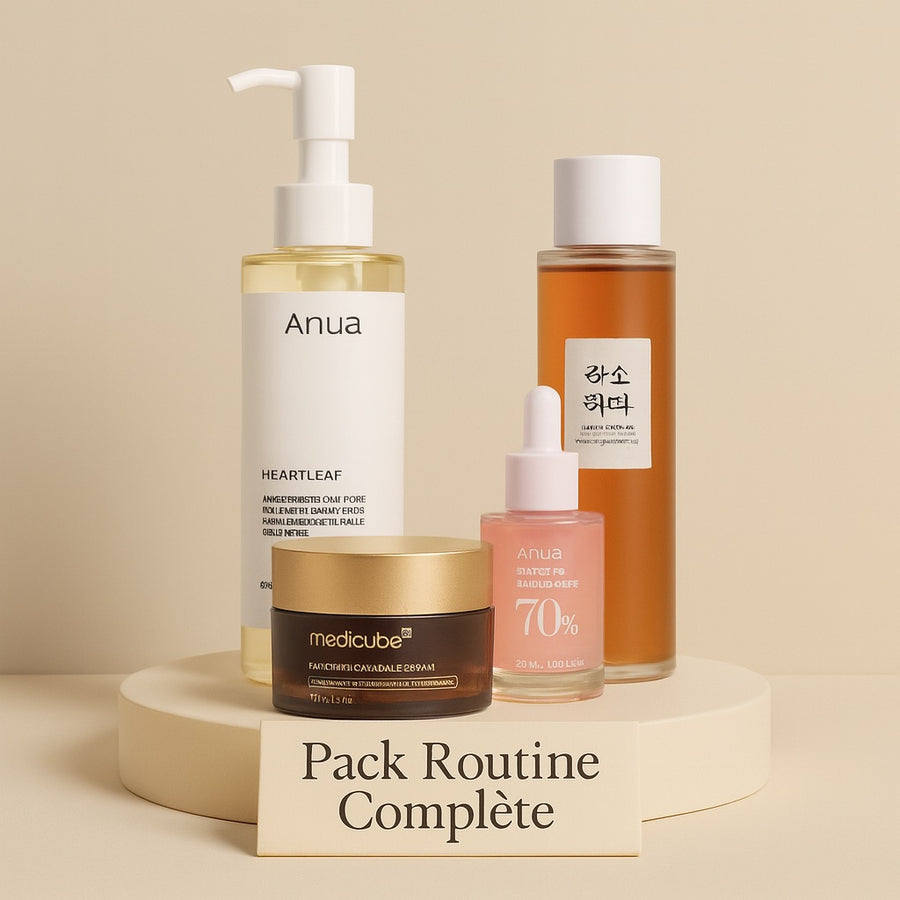 Matin : Nettoyage â Tonique/Essence â SĂ©rum vitamine C/niacinamide â CrĂšme lĂ©gĂšre â SPF 50+.