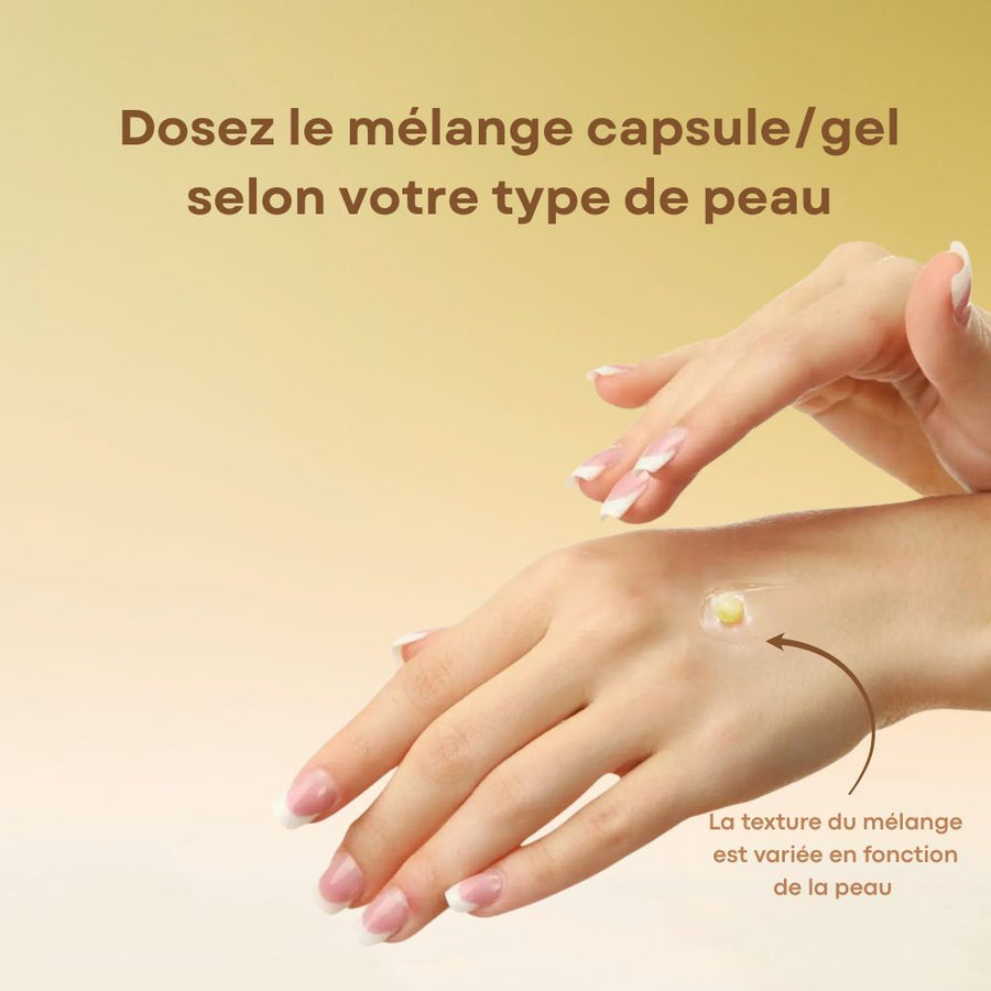 Oui. Mélange les deux parties juste avant l’application pour garantir fraîcheur, efficacité et adaptation à ton type de peau (plus de gel = texture légère ; plus de capsule = texture riche).